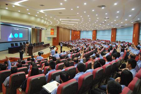 张晓燕老师应5713国企邀请,为职员做《心态调试》讲座,图为张晓燕老师演讲现场。